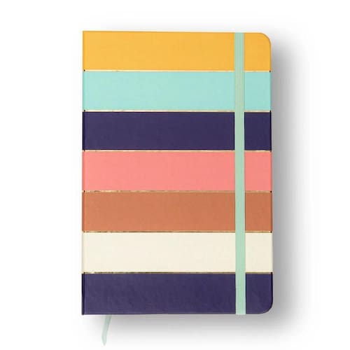 A Caderneta Cícero 14x21 possui capa dura, cantos arredondados, e elástico em cor contrastante para fechar, além de fita em cetim para marcar página e bolsa para guardar cartões.