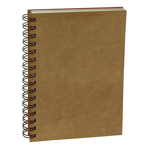 Especificações Técnicas: Tipo: Caderno A5 Miolo: Liso sem pauta, com 5 cores 25 folhas de cada: branca, verde, amarela, azul, rosa Capa: Dura, em Papel Kraft 840g empastado Papel do Miolo: Offset/superbond 75g Encadernação: Wire-o Bronze Dimensões: 148 x 210 mm A5 Quantidade de Folhas: 125