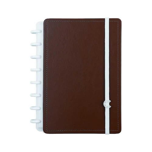 A5, Médio ou Grande: Capa e contracapa rígidas, 01 bolsa plástica, 01 folha de instrução de uso e manuseio, com refis e acessórios da marca disponíveis no verso, 01 folha de identificação com calendário no verso, 04 divisórias com abas para identificação 02 pretas e 02 transparentes , 80 folhas offset 90g 60 folhas pautadas e 20 folhas lisas brancas para impressão , 01 suporte com elástico para 01 caneta ou 01 lápis e discos M + elástico.