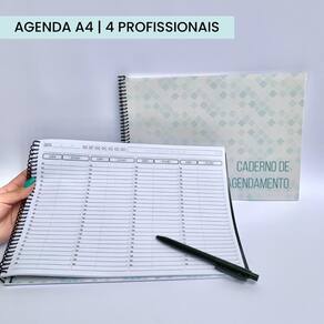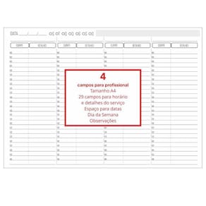 Tamanho a4 -4 campos para profissional- Campos para horário Espaço para: datas / dia da semana / observações Encadernação espiral Capa 250g + pvc transparente para proteção 150 páginas diárias. duração média 6 meses - 75 fls