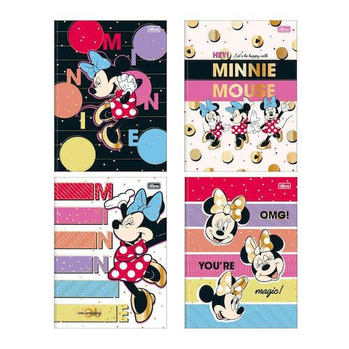 A personagem mais famosa da Disney, Minnie, é uma febre! Com diversos produtos no mercado, conquista a todos, seja com suas expressões meigas e seu laço único, ou com suas cores e estampas marcantes. A linha possui cadernos brochura em tamanho universitário, de capa dura com parte interna estampada, adesivos e 80 folhas pautadas.