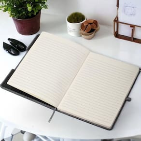 O caderno conta com um suporte para celular na capa, permitindo que você acesse rapidamente suas notificações ou faça chamadas enquanto escreve. Este recurso torna o uso do caderno ainda mais dinâmico e adaptável às suas necessidades cotidianas.