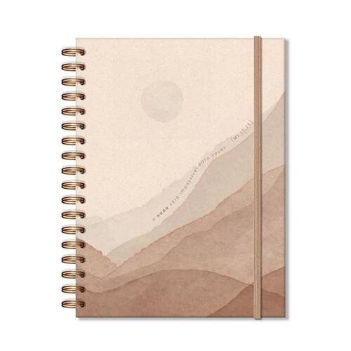 Capa dura, miolo pautado com 80 folhas, formato 17,3 cm x 23,5 cm, papel offset 90 g/m2 (a tinta das canetas não passa para o outro lado), encadernação wire-o e elástico para fechamento. Acompanha envelope resistente para documentos e folha de adesivos.
