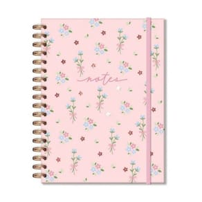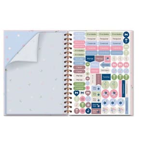 Capa dura, miolo pautado com 80 folhas, formato 17,3 cm x 23,5 cm, papel offset 90 g/m2 (a tinta das canetas não passa para o outro lado), encadernação wire-o e elástico para fechamento. Acompanha envelope resistente para documentos e folha de adesivos.