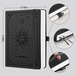 EMSHOI Caderno em branco – 320 páginas, papel grosso de 100 g/m², couro de capa dura A5, caderno de desenho para desenho, sem forro, livro de esboço simples para mulheres e homens, escrita de trabalho, 14 x 21 cm, preto - Caderno de diário em branco: o diário EMSHOI "SUN" é um tamanho clássico A5 (14,5 cm x 21,1 cm) com 320 páginas, papel 100 GSM sem ácido, uma capa dura de couro premium com padrão solar com 2 marcadores de fita, um bolso traseiro, um suporte de caneta, um fecho elástico e um modelo de grafite podem ajudá-lo a realizar a arte de pintura DIY projetos e trazer-lhe mais Divertido - Papel premium 100 GSM: o papel grosso de alta qualidade de 100 g/m2 permite que suas ideias, palavras e escrita criativa fluam suavemente. Você pode usar a maioria das canetas, lápis e marcadores sem fantasmas ou sangramento, e mergulhar na alegria de escrever em papel de alta qualidade - Design LAY-FLAT 180°: este caderno clássico em branco apresenta um design plano de 180° que torna a escrita mais fácil e eficiente e a leitura mais conveniente. Perfeito para pintura, esboço, anotações e diário, atende facilmente às suas várias necessidades de uso - Artística e durabilidade: o diário EMSHOI "SUN" apresenta arte premium e uma capa de couro sintético resistente costurada à mão para garantir a longevidade e a proteção de suas notas preciosas. A capa dura é um prazer tátil, permitindo que você explore suas páginas com conforto e facilidade - Vários usos: o diário em branco espesso pode fornecer uma ampla tela para sua imaginação, expressão de escrita criativa ou rabiscos, pinturas e esboços. Perfeito para todos os escritórios, escolas, viagens e uso doméstico