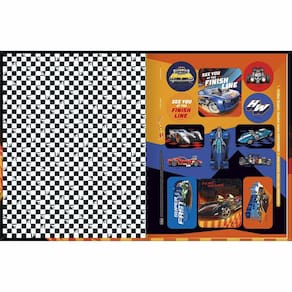 O Caderno Brochura Capa Dura Caligrafia Hot Wheels 40 Folhas possui capa dura com a parte interna decorada e folhas com pautas específicas para atividades de caligrafia.
