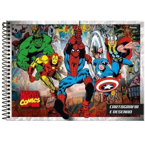 Caderno de Cartografia e Desenho Marvel 80 Folhas - Foroni Descrição O caderno de Cartografia e Desenho Marvel traz visual dos quadrinhos antigos da Marvel com os heróis em suas formas clássicas, possui 80 folhas e um encarte para colorir. Especificações - Capa Dura - Espiral Preto - 1 Página para colorir - 80 Folhas Ean: 7908077449056