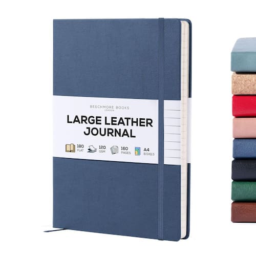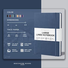 BEECHMORE BOOKS Caderno de diário forrado, 21,5 x 29 cm, A4 160 páginas forradas, diários de couro de capa dura para mulheres, homens, anotações e cadernos para trabalho - papel grosso de 120 g/m², - Tamanho espaçoso para grandes ideias – Perfeito para trabalho, diário ou projetos criativos, nossas páginas perfuradas de couro sem ácido oferecem muito espaço para capturar seus pensamentos sem se sentir constrangido. - Aproveite a escrita sem derramamento – Este caderno profissional de capa dura usa páginas grossas que resistem a sangramento de tinta para usuários de caneta-tinteiro. Cada palavra permanece intocada e legível, não importa a sua escolha de caneta! - Faça uma declaração elegante – com folhas de creme marfim, este caderno A4 pautado pela faculdade exala sofisticação. Projetado no Reino Unido, este caderno para escritores é perfeito para profissionais e criativos. - Feito para sua conveniência – a encadernação plana de 180° do diário pautado largo A4, fecho elástico, bolso traseiro profundo e fita de marcador de página oferecem praticidade moderna e uma experiência premium. - Encante seus entes queridos – Ideal para negócios e uso pessoal, este caderno A4 de capa dura vem lindamente embalado em uma caixa de presente, tornando-o um presente memorável para qualquer ocasião.