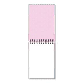 Capa dura, miolo liso, formato 14,5 cm x 20,5 cm, 80 folhas em papel offset 120g/m2 (a caneta não passa para o outro lado), encadernação wire-o e elástico para fechamento.