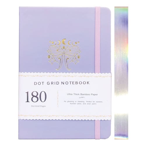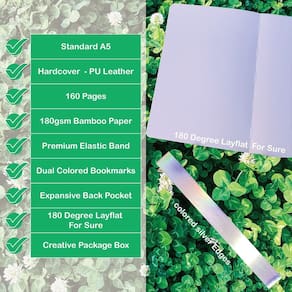 Descrição: capa dura - cantos arredondados - papel ultra bambu, 180 g/m², - 160 páginas - 5 x 5 mm pontilhado - 143 x 205 mm para tamanho de páginas internas - marcador de página combinando - fica plano, aberto a 180° - capa de couro PU fino - estampagem em folha na cor prata colorida - bolso interno expansível na parte de trás. - ? Tamanho: 5,7 x 20,8 cm (A5 médio/143 x 205 mm para tamanho de páginas internas); 160 páginas (80 folhas); Layout da página: Grade pontilhada 5 x 5 mm. - ? Papel ultra bambu – 180 gsm: excelente para canetas-tinteiro e tinta. Você também pode tentar escurecer aquarela. Papel grosso. Encadernação forte: as páginas não são removidas da capa. A encadernação arredondada mantém as páginas apertadas - ? Projetada para resistir ao uso diário: a capa de couro sintético sedoso e resistente protege seus planos e ideias por muitos anos. A encadernação forte significa que mesmo os jornalistas não terão que se preocupar com páginas caindo devido à escrita ávida. Design plano para uma escrita mais suave. - ? Seja criativo e produtivo – onde quer que você esteja: o diário não é um hobby, é um estilo de vida. Este diário A5 é perfeito para portabilidade e melhor para viagens, para que você possa tê-lo com você em todos os momentos. - ? DIÁRIO PONTADO PONTADO EM ÁGUA TODAS AS VEZES: Canetas e marcadores deslizam pelo papel ultra suave à prova de tinta 180gsm sem ácido. Sangramento mínimo, fantasmas e penas para reflexões dupla-face lindamente limpas.