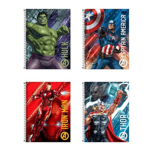 O caderno espiral universitário 1 matéria avengers (Os Vingadores) 80 folhas possui capa dura com a parte interna decorada, bolsa plástica para guardar trabalhos e anotações, folha com adesivos funcionais, folhas pautadas e espiral colorido. Ideal para o dia a dia na escola ou na faculdade.