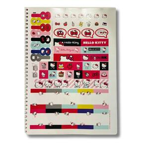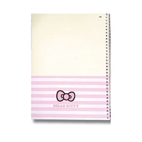 Possui capa dura com a parte interna decorada, bolsa de papel para guardar trabalhos e anotações, com o nome da gatinha mais fofa da sanrio.