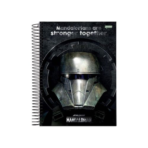 Caderno Espiral Universitário Capa Dura 10 Matérias 160 Fls Mandalorian Jandaia. Possui Capa Com Foil metalizado, Bolsa Decorada Para Guardar Trabalhos E Anotações, Folha De Adesivos Funcionais Personalizado, Folhas Pautadas Decoradas, E Espiral preto. Ideal Para O Seu Dia A Dia. Ean: 7894494741166