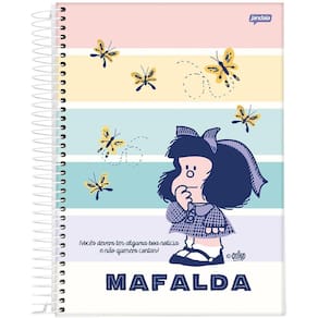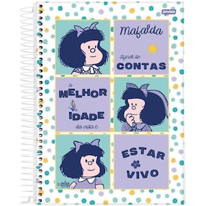 Capas enviadas de forma , conforme disponibilidade em . Caderno espiral universitário - mafalda mafalda foi uma tira escrita e desenhada pelo cartunista argentino quino. As histórias, apresentando uma menina mafalda preocupada com a humanidade e a paz mundial que se rebela com o estado atual do mundo, apareceram de 1964 a 1973, usufruindo de uma altíssima popularidade na américa latina e europa. Mafalda: a personagem principal, uma menina de seis anos de idade, que odeia sopa e adora os beatles e o desenho pica-pau. Ela se comporta como uma típica menina na sua idade, mas tem uma visão aguda da vida e vive questionando o mundo à sua volta, principalmente o contexto dos anos 1960 em que se encontra. Tem uma visão mais humanista e aguçada do mundo em comparação com os outros personagens. Especificações técnicas Laminação fosca Hotstamping Verniz reserva Bolso em papel Cartela de adesivos Miolo decorado Disponível em: caderno universitário capa dura 10 matérias 160 folhas Marca: Não Informado