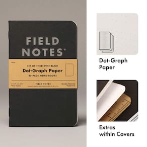 Pacote com 3 livros de notas Field Notes Pitch Black (3,5" x 5,5"), gráfico de pontos, 48 páginas | Caderno EDC fino de bolso com papel de 90 g/m2 e capa de bolso | Cadernos de trabalho para fazer anotações | Fabricado nos EUA - CADERNO DE BOLSO, PERFEITO - Lançamos nosso livro de notas de campo “Pitch Black” em 2013, e ele rapidamente se tornou um dos nossos livros de notas de campo mais populares. Com 3,5" x 5,5", este pacote de 3 diários tem o tamanho perfeito para caber no bolso de sua camisa, calça ou bolsa. Como sempre, as capas internas apresentam nossas especificações e aplicações práticas usuais. - GRÁFICO DE PONTOS OU DIÁRIO PAUTADO - Este caderno de diário de 48 páginas foi projetado com a melhor versatilidade da categoria. Escolha entre papel gráfico pontilhado ou pautado, impresso com tinta à base de soja, para escrever um diário diário com marcadores, rastrear divagações à meia-noite ou rabiscar poemas quando a inspiração surgir. - SEM ÁCIDO, BRANCO BRILHANTE - Cada diário de campo apresenta papel corporal Finch Opaque fabricado com responsabilidade, de 60 libras (90 GSM), no qual é um prazer escrever, pois é mais suave e mais substancial do que um bloco de notas ou cadernos de composição típicos. As páginas sem ácido mantêm uma cor branca brilhante para preservar esboços, registros de observação ou listas de tarefas. - CAPAS RESISTENTES E DURÁVEIS — Guarde seu caderno Field Notes no bolso, carro ou mochila para transporte diário. A capa impressa em frente e verso, feita de cartolina kraft de 118 libras (320 GSM) da French Paper Co. em Michigan, lida com tratamentos difíceis sem rasgar ou enrolar. É unido por um ponto de sela e três grampos pretos brilhantes que suportam uma camada plana para tornar as entradas rápidas fáceis e eficientes. - IMPRESSO E FABRICADO COM ORGULHO NOS EUA - Temos muito orgulho de nossas histórias de origem completas e transparentes. Cada um de nossos cadernos e diários finos é repleto de evidências de nossos processos que priorizam o artesanato, como páginas impressas localmente de fornecedores do centro-oeste e cantos arredondados com precisão estampados por uma máquina anotada na contracapa.