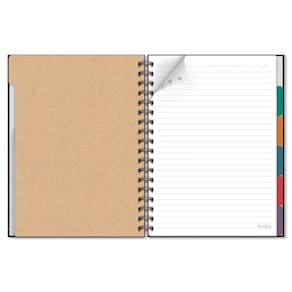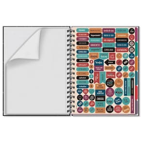 Caderno Folhas Removíveis Geométrico Fina Ideia: - Caderno capa dura com estampa exclusiva e frase em hot stamp dourado; - Formato 16,5x23,2cm; - Miolo pautado com 80 folhas removíveis em papel offset 90g/m; - 6 divisórias removíveis coloridas e estampadas em papel Kraft 200g/m; - Encadernação wire-o e elástico para fechamento; - Acompanha envelope para documentos resistente e folha de adesivos.