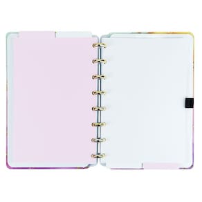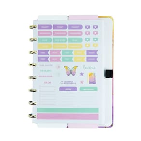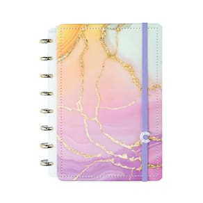 O Caderno Aurora é uma explosão de cores suaves, combinando tons de rosa, amarelo, roxo e verde clarinho, que se assemelham a um elegante mármore. Detalhes em dourado adicionam um toque de sofisticação, elevando a experiência de uso.