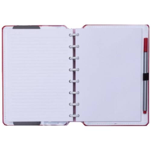 Capa dura, miolo com 80 folhas, 60 folhas pautadas e 20 folhas brancas para impressão formato 140mm x 200mm, papel off set 90g, 08 discos em ABS, revestimento especial na capa e elástico para fechamento.
