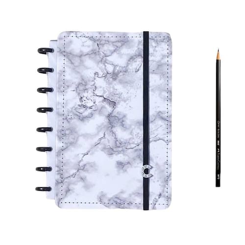 A5: Capa e contracapa rígidas, 01 bolsa plástica, 01 folha de instrução de uso e manuseio, com refis e acessórios da marca disponíveis no verso, 01 folha de identificação com calendário no verso, 04 divisórias com abas para identificação (02 pretas e 02 transparentes), 80 folhas offset 90g (60 folhas pautadas e 20 folhas lisas brancas para impressão), 01 suporte com elástico para 01 caneta ou 01 lápis e discos M + elástico. Medidas aproximadas do produto - Comprimento: 21 cm - Altura: 7 cm - Largura: 27 cm - Peso: 700 g