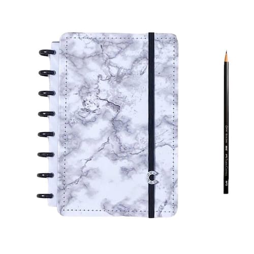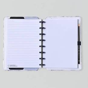Caderno Inteligente A5 Pequeno Bianco 80 Folhas A5: Capa e contracapa rígidas, 01 bolsa plástica, 01 folha de instrução de uso e manuseio, com refis e acessórios da marca disponíveis no verso, 01 folha de identificação com calendário no verso, 04 divisórias com abas para identificação (02 pretas e 02 transparentes), 80 folhas offset 90g (60 folhas pautadas e 20 folhas lisas brancas para impressão), 01 suporte com elástico para 01 caneta ou 01 lápis e discos M + elástico.Medidas aproximadas do produto- Comprimento: 21 cm- Altura: 7 cm- Largura: 27 cm- Peso: 700 g
