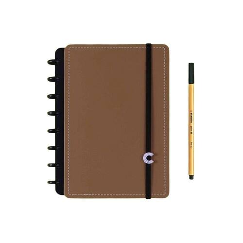 Caderno Inteligente A5 Pequeno Caramel - 80 Folhas Caderno Inteligente A5 Pequeno Caramel - 80 Folhas A5 Pequeno: Capa e contracapa rígidas, 01 bolsa plástica, 01 folha de instrução de uso e manuseio, com refis e acessórios da marca disponíveis no verso, 01 folha de identificação com calendário no verso, 04 divisórias com abas para identificação (02 pretas e 02 transparentes), 80 folhas offset 90g (60 folhas pautadas e 20 folhas lisas brancas para impressão), 01 suporte com elástico para 01 caneta ou 01 lápis e discos M + elástico. tamanho: 22cm X 15,5cm