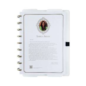 - Capa e contracapa rígidas; - 01 folha de adesivos exclusivos; - 01 bolsa plástica; - 01 folha de instrução de uso e manuseio, com refis e acessórios da marca disponíveis no verso; - 01 folha de identificação com calendário no verso; - 01 folha de identificação com calendário no verso; - 01 folha de apresentação Isabela Akkari; - 01 folha de receita Isabela Akkari; - 01 folha para anotação de receita; - 04 divisórias clean (02 transparentes e 02 branco gelo) com abas para identificação localizadas nas laterais; - 80 folhas offset 90g (60 folhas pautadas e 20 folhas lisas brancas para impressão); - 01 suporte com elástico para 01 caneta ou 01 lápis; - Discos M + elástico.