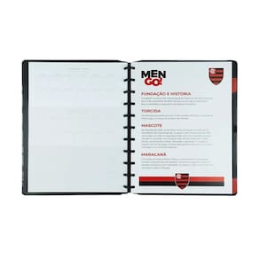 O que contém: Capa e contracapa rígidas, 1 bolsa plástica, 1 folha de instrução de uso e manuseio, com refis e acessórios da marca disponíveis no verso, 1 folha de identificação com calendário no verso, 4 divisórias com abas para identificação 2 pretas e 2 vermelhas . 80 folhas offset 90g 60 Folhas Pautadas com logo do time e 20 folhas lisas brancas para impressão Ean: 7895098728836