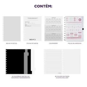 O caderno contém: - Capa e contracapa rígidas - Caderno com Refil de Linhas Brancas - 01 bolsa plástica - 01 folha de instrução de uso e manuseio - 01 folha de identificação com calendário no verso - 04 divisórias com abas para identificação 02 pretas e 02 transparentes - 80 folhas offset 90g 60 folhas pautadas linhas brancas e 20 folhas lisas brancas para impressão - 01 suporte com elástico para 01 caneta ou 01 lápis.