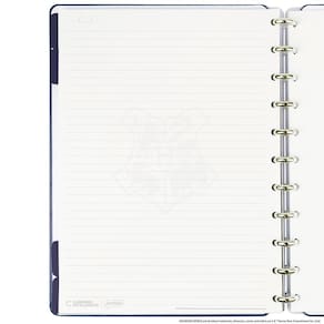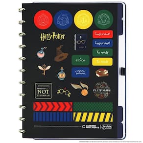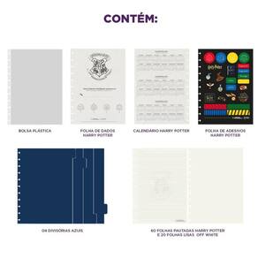 Características: - capa e contracapa rígidas, - 01 folha de adesivos personalizados, - 01 bolsa plástica, - 01 folha de instrução de uso e manuseio, com informações de refis e acessórios da marca disponíveis no verso, - 01 folha de identificação off white com calendário no verso, - 04 divisórias com abas para identificação azuis , - 80 folhas offset 90g 60 folhas pautadas off white harry potter e 20 folhas lisas brancas para impressão - 01 suporte com elástico para 01 caneta ou 01 lápis, - discos + elástico.