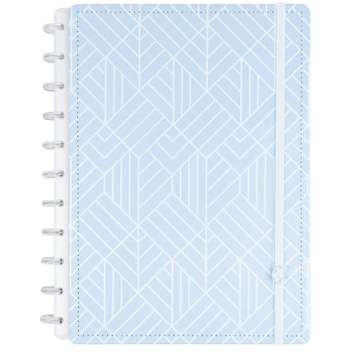Um design único e sofisticado em azul claro e detalhes em high print. A experiência fica completa com as folhas azuis linhas brancas. Um diferencial para estudantes e apaixonados por papelaria.