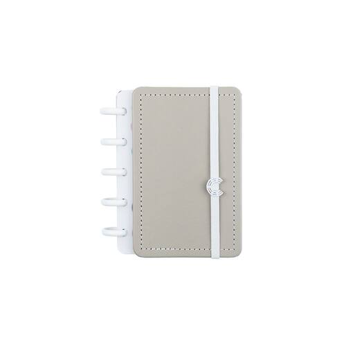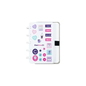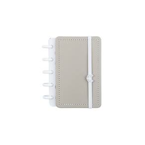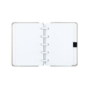 -A5, Médio ou Grande: Capa e contracapa rígidas, 01 folha de adesivos, 01 bolsa plástica, 01 folha de instrução de uso e manuseio, com refis e acessórios da marca disponíveis no verso, 01 folha de identificação com calendário no verso, 04 divisórias com abas para identificação, 80 folhas offset 90g (60 folhas pautadas e 20 folhas lisas brancas para impressão), 01 suporte com elástico para 01 caneta ou 01 lápis e discos M + elástico.