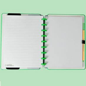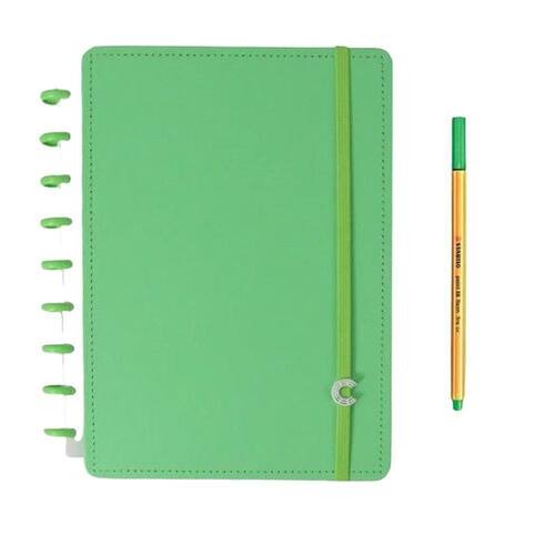 Caderno Inteligente Medio All Green - 80 Folhas Caderno Inteligente Medio All Green - 80 FolhasMedio: Capa e contracapa rígidas, 01 bolsa plástica, 01 folha de instrução de uso e manuseio, com refis e acessórios da marca disponíveis no verso, 01 folha de identificação com calendário no verso, 04 divisórias com abas para identificação (02 pretas e 02 transparentes), 80 folhas offset 90g (60 folhas pautadas e 20 folhas lisas brancas para impressão), 01 suporte com elástico para 01 caneta ou 01 lápis e discos M + elástico. tamanho: 25,5cm X 19cm Obs.: Por se tratar de um produto artesanal, a tonalidade pode variar um pouco. :)O caderno que você tira e coloca folhas quando quiser ;)Caderno inteligente, só Caderno Inteligente. Imagem Meramente Ilustrativa, acessorios da foto nao incluso.