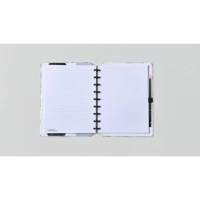 No Caderno Médio contém: 80 folhas 90g (60 folhas pautadas e 20 folhas lisas brancas) Capa e contracapa rígidas01 bolsa plástica 01 folha de instrução de uso e manuseio 01 folha de identificação com calendário no verso 04 divisórias com abas (02 pretas e 02 transparentes) 01 suporte com elástico para 01 caneta ou 01 lápis e discos M + elástico.