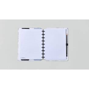 O caderno que você tira e coloca folhas quando quiser ;)No Caderno Médio contém: 80 folhas 90g (60 folhas pautadas e 20 folhas lisas brancas)Capa e contracapa rígidas01 bolsa plástica01 folha de instrução de uso e manuseio01 folha de identificação com calendário no verso04 divisórias com abas (02 pretas e 02 transparentes)01 suporte com elástico para 01 caneta ou 01 lápis e discos M + elástico.Medidas aproximadas do produto- Comprimento: 25,5 cm- Altura: 2 cm- Largura: 20 cm- Peso: 630 g