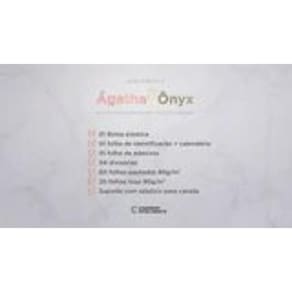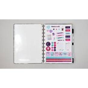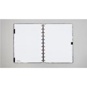 capa e contracapa rígidas, 01 folha de adesivos, 01 bolsa plástica, 01 folha de instrução de uso e manuseio, com refis e acessórios da marca disponíveis no verso, 01 folha de identificação com calendário no verso, 04 divisórias com abas para identificação 02 pretas e 02 transparentes , 80 folhas offset 90g 60 folhas pautadas e 20 folhas lisas brancas para impressão , 01 suporte com elástico para 01 caneta ou 01 lápis e discos m + elástico.