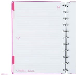 Características: - capa e contracapa rígidas, - 01 folha de adesivos, - 01 bolsa plástica, - 01 folha de instrução de uso e manuseio, com informações de refis e acessórios da marca disponíveis no verso, - 01 folha de identificação com calendário no verso, - 04 divisórias com abas para identificação 02 rosa choque e 02 rosa claro , - 80 folhas offset 90g 60 folhas pautadas e 20 folhas lisas brancas para impressão - 01 suporte com elástico para 01 caneta ou 01 lápis.