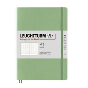 LEUCHTTURM1917 - Caderno de capa mole média A5-123 páginas numeradas para escrita e diário (pontilhado, sálvia) - A capa mole A5 média tem todos os detalhes LEUCHTTURM1917 extras, mas é significativamente mais leve e mais fina do que a capa dura média como resultado de menos páginas (123 páginas) e a capa mole flexível - Rosca para abrir plana, o que ajuda a facilitar a leitura do conteúdo e adiciona eficiência às anotações - Possui papel sem ácido de 80 g/m² com alta compatibilidade de tinta para ajudar a evitar derramamento, um bolso reforçado expansível na capa traseira, 2 marcadores de página de fita e uma faixa de fecho elástico - Inclui 123 páginas numeradas com 8 folhas destacáveis perfuradas, um índice em branco para facilitar a organização e anotações, e adesivos para etiquetar e arquivar - Este caderno de capa mole durável tem papel MIX certificado FSC feito de fontes responsáveis — mede aproximadamente 145 x 210 mm, o mesmo tamanho de muitos tablets