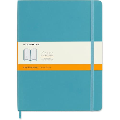 Moleskine Caderno clássico, capa macia, GG (19 cm x 24 cm) pautado/forrado, azul recife, 192 páginas - Caderno clássico Moleskine: os cadernos clássicos da Moleskine são cadernos perfeitos para escrever diários, um diário ou anotações em aulas ou reuniões universitárias. Os cadernos Moleskine são adorados por viajantes e jornalistas por seu design fino. - Capa durável e fecho elástico: segure projetos e notas de escrita em seu caderno Moleskine com uma faixa elástica e pastas de armazenamento internas. Capa Moleskine clássica semelhante a couro e páginas grossas de papel marfim são perfeitas para escrever com canetas-tinteiro. - Cadernos de qualidade para presente: as agendas, diários e cadernos Moleskine vêm em capa dura ou capa mole e cores como preto, vermelho, azul, verde e marrom. A encadernação e a capa têm um acabamento durável, projetado para diário diário, escrita e esboço. - Páginas de qualidade luxuosa: as páginas grossas de papel marfim da Moleskine em um caderno Moleskine de capa dura, caderno Moleskine de capa macia, diário cahier ou volant ou planejador Moleskine são perfeitamente texturizadas para escrever com uma caneta esferográfica, caneta-tinteiro ou lápis. - MOLESKINE QUALIDADE: Somos dedicados à cultura, viagens, memória, imaginação e identidade pessoal — tanto física quanto digital. Trazemos esse compromisso com nossos cadernos, bolsas, aplicativos, canetas e cadernos inteligentes.