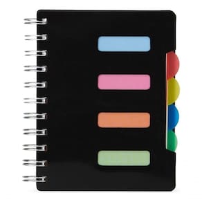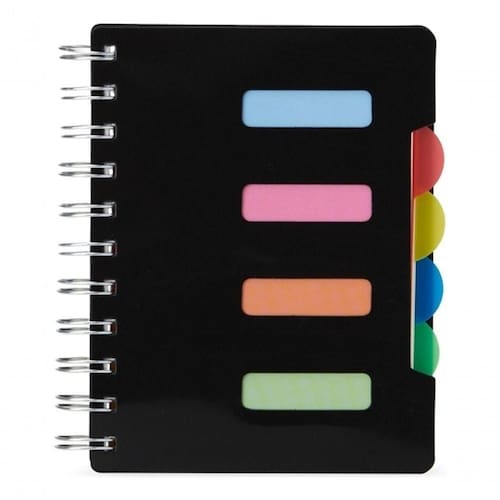Caderno pequeno com 4 divisórias e abas para identificações, capa plástica com wire-o metálico. Contém aproximadamente 103 folhas marfins e folha inicial com tarjas para organizar e identificar as divisórias.