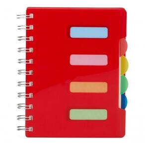 Caderno pequeno com 4 divisórias e abas para identificações, capa plástica com wire-o metálico. Contém aproximadamente 103 folhas marfins e folha inicial com tarjas para organizar e identificar as divisórias.