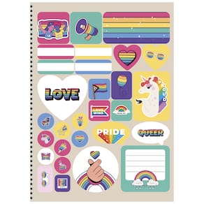 Caderno Universitário capa dura, 80fl, bolsa e adesivos.