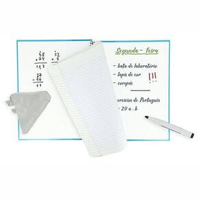 - Com quadro branco dentro das 2 contra capas, que permite escrever com caneta de quadro branco e apagar.
