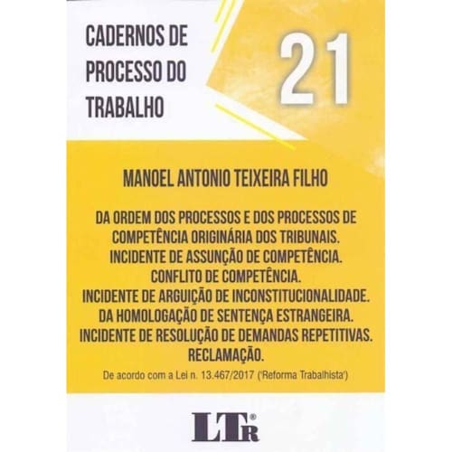 Os Cadernos de Processo do Trabalho compõem uma excelente coleção elaborada pelo Prof. Manoel Antonio Teixeira Filho, um dos mais destacados juristas do País. Os temas selecionados são de grande interesse prático para magistrados, advogados, membros do Ministério Público, professores e acadêmicos de Direito. A exposição é feita de maneira didática, sem prejuízo do aprofundamento do conteúdo. No volume 21 - Da ordem dos processos e dos processos de competência originária dos tribunais. Incidente de assunção de competência. Conflito de competência. Incidente de arguição de inconstitucionalidade. Da homologação de sentença estrangeira. Incidente de resolução de demandas repetitivas. Reclamação.