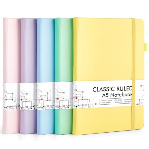 feela Pacote com 5 cadernos a granel, diários pautados clássicos de capa dura com suporte de caneta para mulheres, meninas, material escolar, com 5 canetas pretas, 120 g/m2, 13 x 21 cm, A5, cores - Feela Pacote com 5 cadernos pautados clássicos contém 5 cadernos pautados com capa resistente e 5 canetas pretas retráteis. Cada um dos cadernos mede 21 x 13 cm, o que é perfeito para carregar e facilmente segurado na mão. Estas canetas pretas fofas são personalizadas para serem colocadas no porta-canetas, o que é muito conveniente. - Estes cadernos pautados clássicos são todos em branco por dentro com 128 páginas pautadas (64 folhas), o que seria conveniente para o uso diário. O diário de capa dura tem uma capa de couro sintético resistente à água, cantos arredondados e marcadores de livro, que é projetado para ficar deitado e aberto. Há uma coluna de "data/página" na parte superior de cada página. Você pode usá-lo como um lembrete para lembrar aquelas datas importantes e encontrar a página que deseja em um tempo muito curto. - 5 cores pastel diferentes para estes cadernos. Há 5 canetas pretas retráteis na caixa. Você pode usá-lo assim que receber. Estas canetas são perfeitas para serem colocadas no porta-canetas do caderno pautado clássico. O tubo grande tem a capacidade de restaurar mais tinta, o que os torna duradouros. Secagem rápida pode evitar manchas e manchas. - Feela O conjunto de 5 cadernos pautados clássicos é perfeito para muitas pessoas e muitas ocasiões. Alunos do ensino fundamental e clássico podem usá-lo para escrever notas ou fazer trabalhos de casa. Os passageiros podem usá-lo para organizar seu horário de trabalho diário e anotar marcos importantes. Sua menina ou menino pode usá-lo como o começo de rabiscar e escrever. - Desempenho e satisfação: fornecemos não apenas nossos produtos de alta qualidade, mas também nosso serviço de resposta rápida.