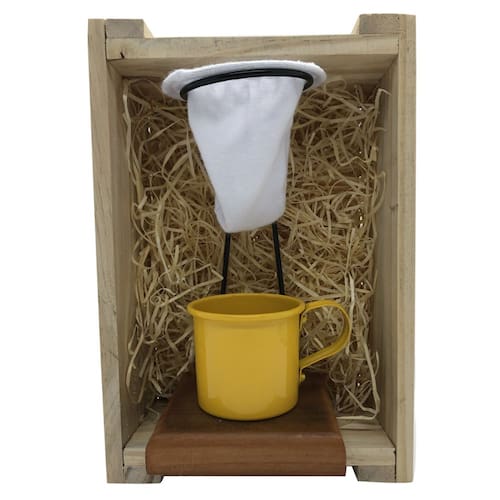 Um belo presente para quem gosta de café coado e quer bebe-lo quando tiver vontade. Esse kit é composto pela base madeira de demolição, coador de pano, 1 uma canequinha, uma caixa de madeira do tipo engradado.