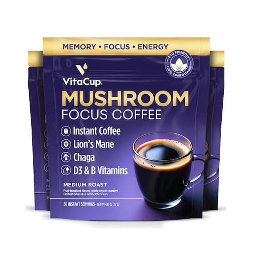- Suporte cognitivo final: o café instantâneo VitaCup Mushroom Focus melhora seu foco e clareza usando uma mistura premium de juba de leão e cogumelos chaga, fortificados com vitaminas B, promovendo a função cognitiva ideal enquanto oferece o sabor rico e robusto de um torrado médio.