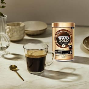 Coloque uma colher de chá 2g de NESCAFÉ GOLD Espresso Intenso em uma xícara. Adicione 50ml de água quente não fervente . Mexa bem e aprecie.