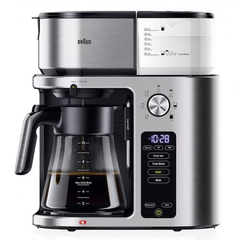 A cafeteira Braun MultiServe Plus KF9270SI prepara café quente, cold brew ou over ice em 7 tamanhos de infusão (xícara única até carafa de 10 copos), com seletor rotativo e configurações Gold ou Bold via painel touch e dial. Sistema ExactBrew ajusta fluxo de água, temperatura e velocidade automaticamente para consistência em cada preparo, completando carafa completa em menos de 8 minutos ou cold brew em 13 minutos. Indicada para uso doméstico sem cápsulas, suporta copo de viagem ou garrafa térmica diretamente.