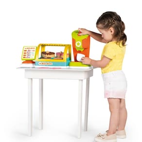 Cafeteira Coffe Center infantil c/ doces, luzes e somÉ hora do café!Que tal servir deliciosos doces recheados de imaginação acompanhados de um expresso quentinho?Com a Coffee Center, os pequenos desenvolvem habilidades através da interação, e comunicação.É uma cafeteria completa, vem com uma estufa recheada de docinhos e duas xícaras, e um painel que gira 360° para brincar de comprar e vender.E tem mais! Para a brincadeira ficar ainda mais divertida, é só abastecer a cafeteira com água e brincar de fazer café expresso.Além disso, tem luz e som como em uma máquina de verdade!Tateti, divertido é brincar junto.Contém:1 Cafeteira2 Xícaras1 Estufa5 LanchesEspecificações:Idade: +3anosMarca: Calesita (TaTeTi)Material: PlásticoAlimentação: Pilhas inclusasMedidas da embalagem (CxLxA):55x17x27cmCom Luzes: SIMCom Som: SIMAs cores dos tecidos e produtos podem variar entre as imagens mostradas acima ou fotos da embalagem. Imagens meramente ilustrativas.