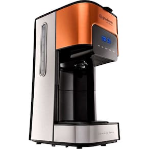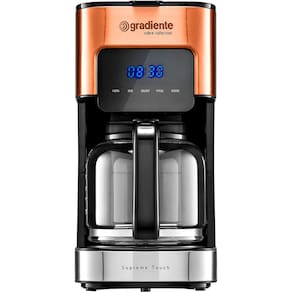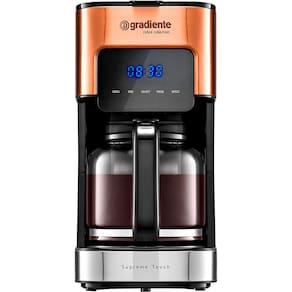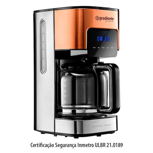 A Cafeteira Digital Programável Supreme Touch - Gradiente tem display moderno e painel touch. Ela possui também a função timer, que permite programar o início do preparo do café com até 24 horas de antecedência. Seu design de alta qualidade traz acabamento em aço inox escovado prata e cobre, ela conta ainda com reservatório transparente e indicação do nível de água. A Cafeteira tem filtro permanente, removível e lavável e prepara até 38 cafés. Se você procura beleza e sofisticação para a sua cozinha essa cafeteira é sua melhor escolha. Marca: Gradiente
